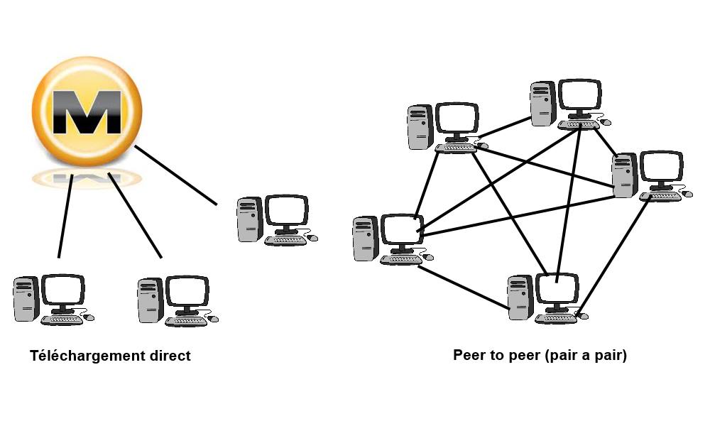- Le deuxième moyen de partage est le P2P "peer to peer" ou "pair à pair" en français, cette technique, contrairement au direct download, ne nécessite pas que le fichier soit héberger sur un serveur prévu pour du téléchargement. En effet, le principe du P2P est que des utilisateurs s'échangent des fichiers directement d'ordinateur à ordinateur, à l'aide d'un logiciel. Pour cela, un utilisateur va par exemple mettre à disposition un film en ligne (upload), et d'autres utilisateurs vont télécharger ce film sur leur ordinateur (download), seulement, les ordinateurs de ceux qui téléchargent le film ne pourront que prendre fragment par fragment sur l'ordinateur de celui qui l'upload, et donc plus il y aura de gens à télécharger, et plus cela prendra du temps, c'est donc pour cela qu'il est nécessaire qu'il y ai beaucoup de monde à proposer le même fichier en même temps, cela fait qu'il y a beaucoup d'upload, et donc le téléchargement sera plus rapide.